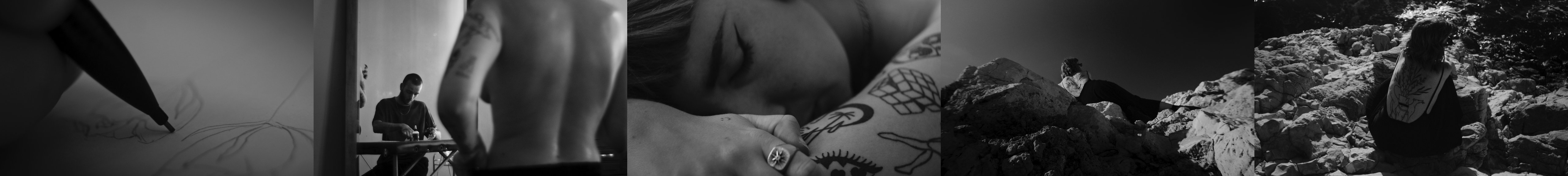 Cinq minutes pour retracer la création d’un tatouage, un dos entier, celui d’Élise. C’est la première fois que Flinart travaille sur un format de cette ampleur, plus proche du tableau que du tatouage. Il nous accueille pendant deux jours dans un grand appartement où plantes, tapis et miroirs se superposent. L’intimité du lieu est suffisante pour laisser pleinement la place au tatoueur et à la tatouée. Une communication silencieuse avec Emma, réalisatrice, permet l’émergence de scènes sincères et douces. Depuis la table à dessin, nous avons la chance de suivre chaque étape de la création du tatouage, mais il était important pour nous de conclure par une séquence d’exposition au monde, une errance dans un extérieur vaste et intemporel. Les calanques de Marseille étaient le décor idéal pour faire ressentir le voyage auquel ce tatouage était destiné. Le noir et blanc s’est imposé comme une évidence pour ce projet. D’abord parce que Flinart a toujours pris plaisir à photographier ses tatouages ainsi, et qu’il était important de s’inscrire dans son langage visuel. Ensuite, la brillance et la densité qui en résulte était la meilleure manière de rendre le trait fin, minutieux et profondément noir du tatouage, Flinart utilise très peu la couleur. Enfin, nous voulions un film où les émotions et les sensibilités soient perceptibles par l’image. Le noir et blanc a été pour nous un moyen d’expression et de sélection, afin d’offrir une représentation du réel équilibrée et de laisser la place restante à l’émotion et au caractère de nos interlocuteur·ice·s.