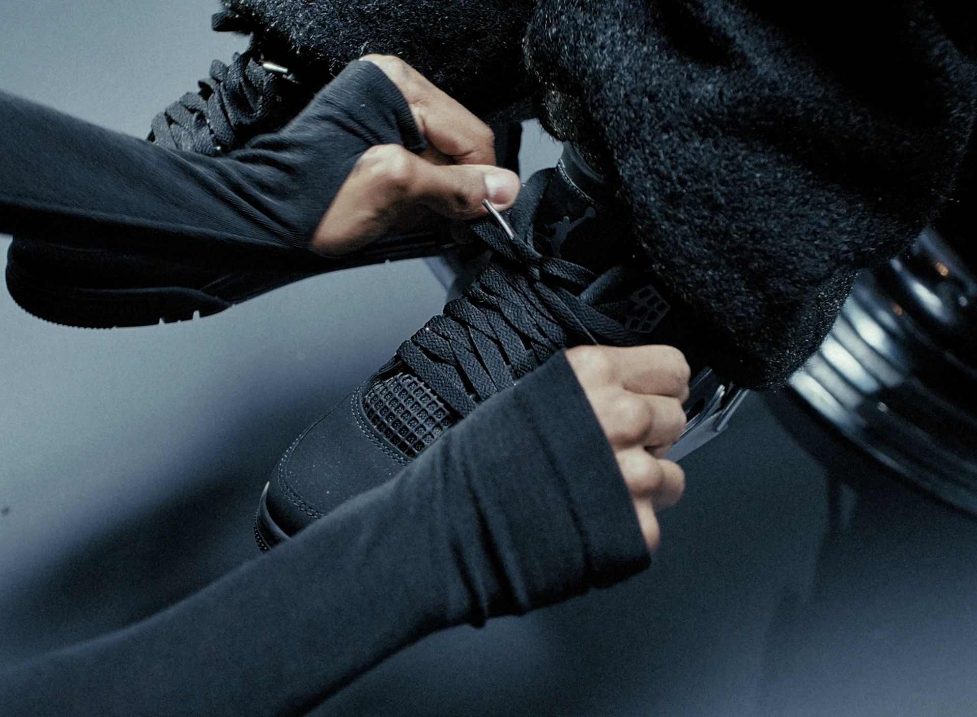 Pour Opium x Jordan – AJ4 Black Cat, réalisé par Léo Joubert, met en scène une jeune artiste au cœur d’un laboratoire, pensé comme un espace de transformation esthétique. Le film, est tourné en studio sur une seule journée, on développe une atmosphère sombre et contrastée, aux teintes désaturées — noirs, blancs, gris et reflets métalliques — afin de créer un univers froid et graphique, en résonance directe avec l’identité de la paire.