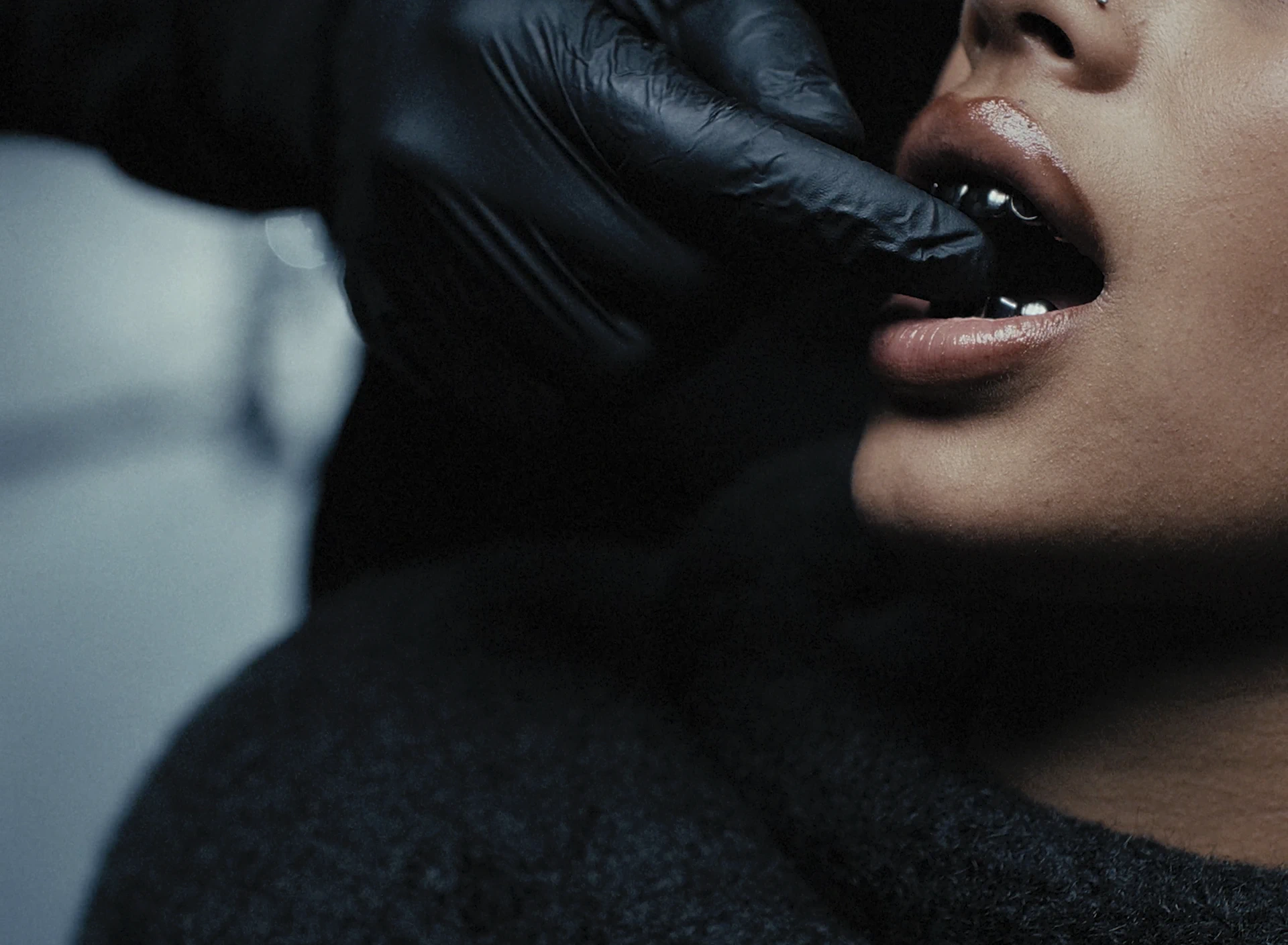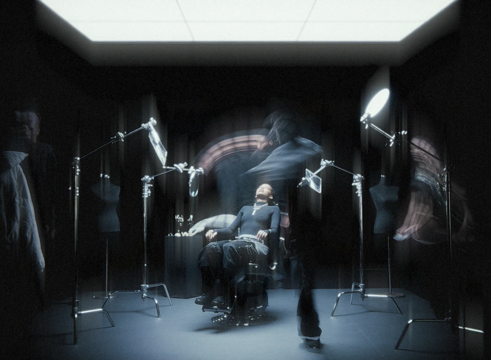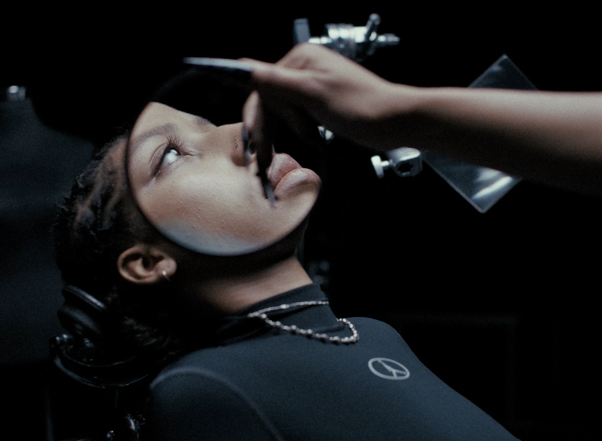 On tourne à l’Alexa Mini avec des Canon FD de TLS et l’Angénieux Optimo HP 25–250mm. La brillance extra des Canon FD TLS nous aides à pousser l’apparition de chaque reflet et pièce métallique. La lumière est presque clinique, découpée sur un décor minimal composé d’une dalle béton et d’une chaise centrale entourée d’éléments optiques : loupes, miroirs teintés, bustes. Ils viennent fragmenter l’image. Le travail d’axes et de reflets nous permet de multiplier les points de vue, de recomposer les silhouettes et d’installer un jeu de tension visuelle permanent autour de la métamorphose de l’artiste.