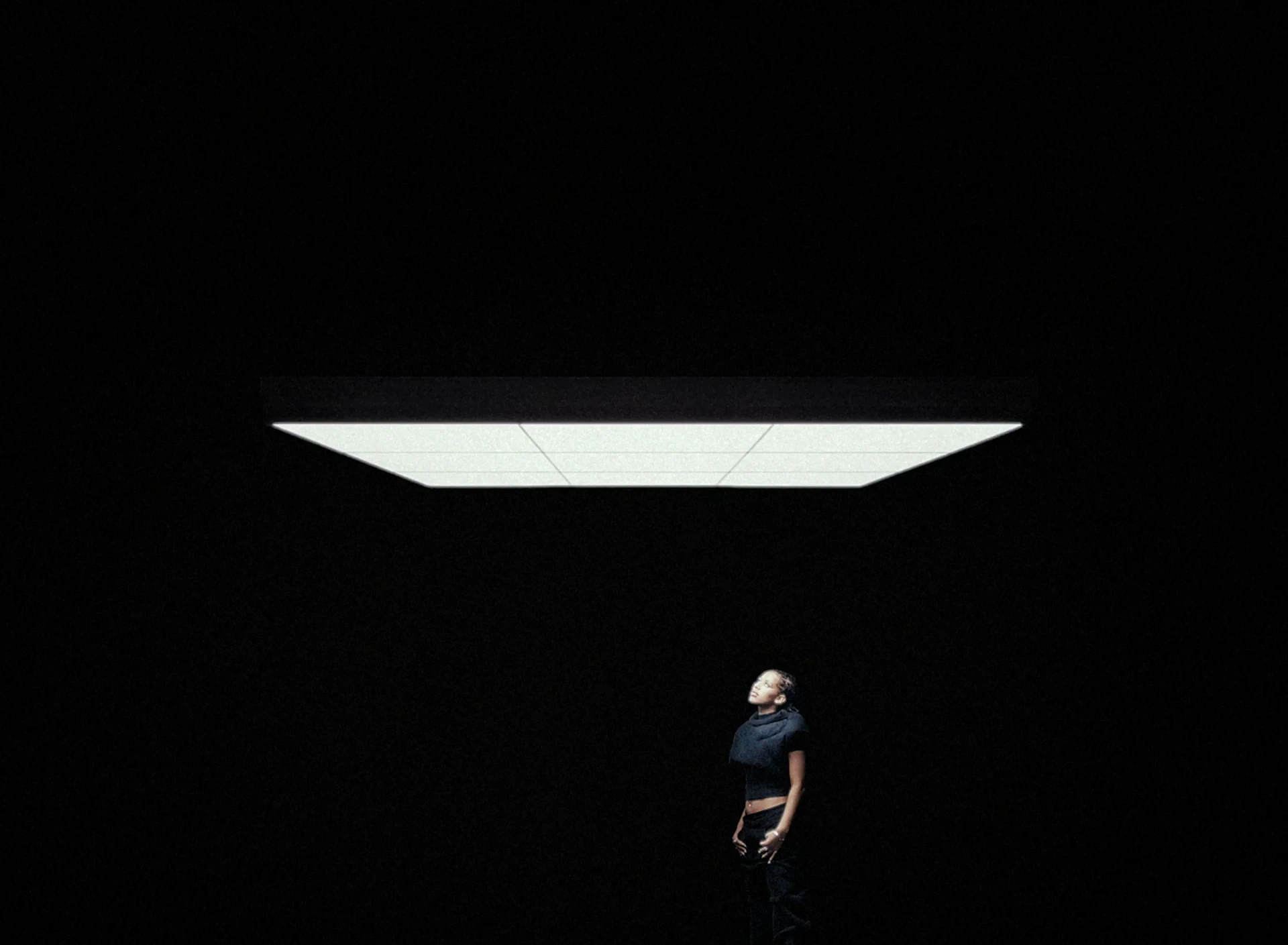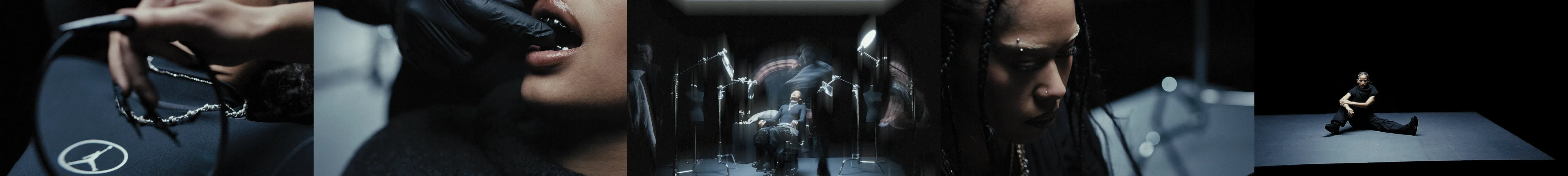 On tourne à l’Alexa Mini avec des Canon FD de TLS et l’Angénieux Optimo HP 25–250mm. La brillance extra des Canon FD TLS nous aides à pousser l’apparition de chaque reflet et pièce métallique. La lumière est presque clinique, découpée sur un décor minimal composé d’une dalle béton et d’une chaise centrale entourée d’éléments optiques : loupes, miroirs teintés, bustes. Ils viennent fragmenter l’image. Le travail d’axes et de reflets nous permet de multiplier les points de vue, de recomposer les silhouettes et d’installer un jeu de tension visuelle permanent autour de la métamorphose de l’artiste.