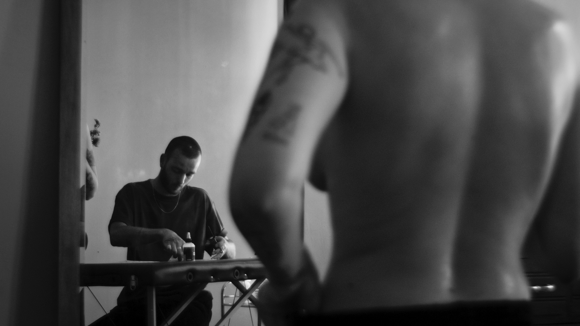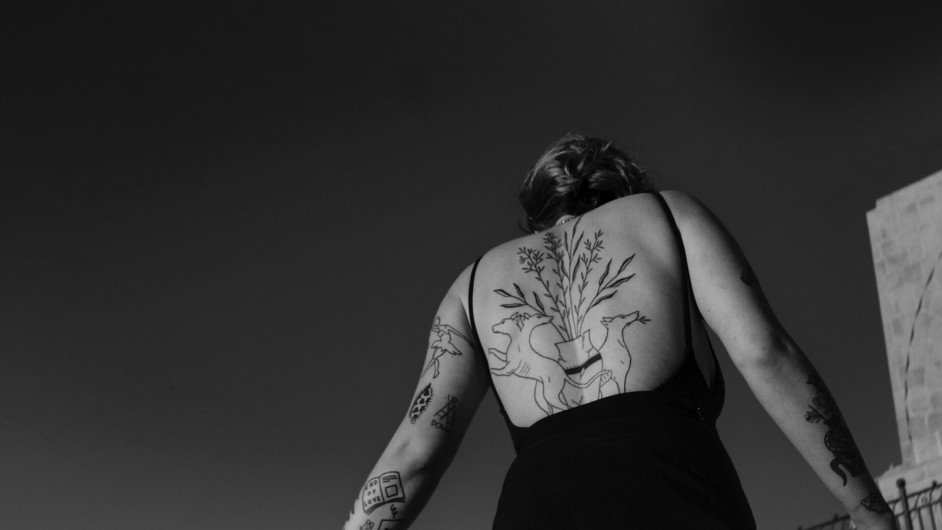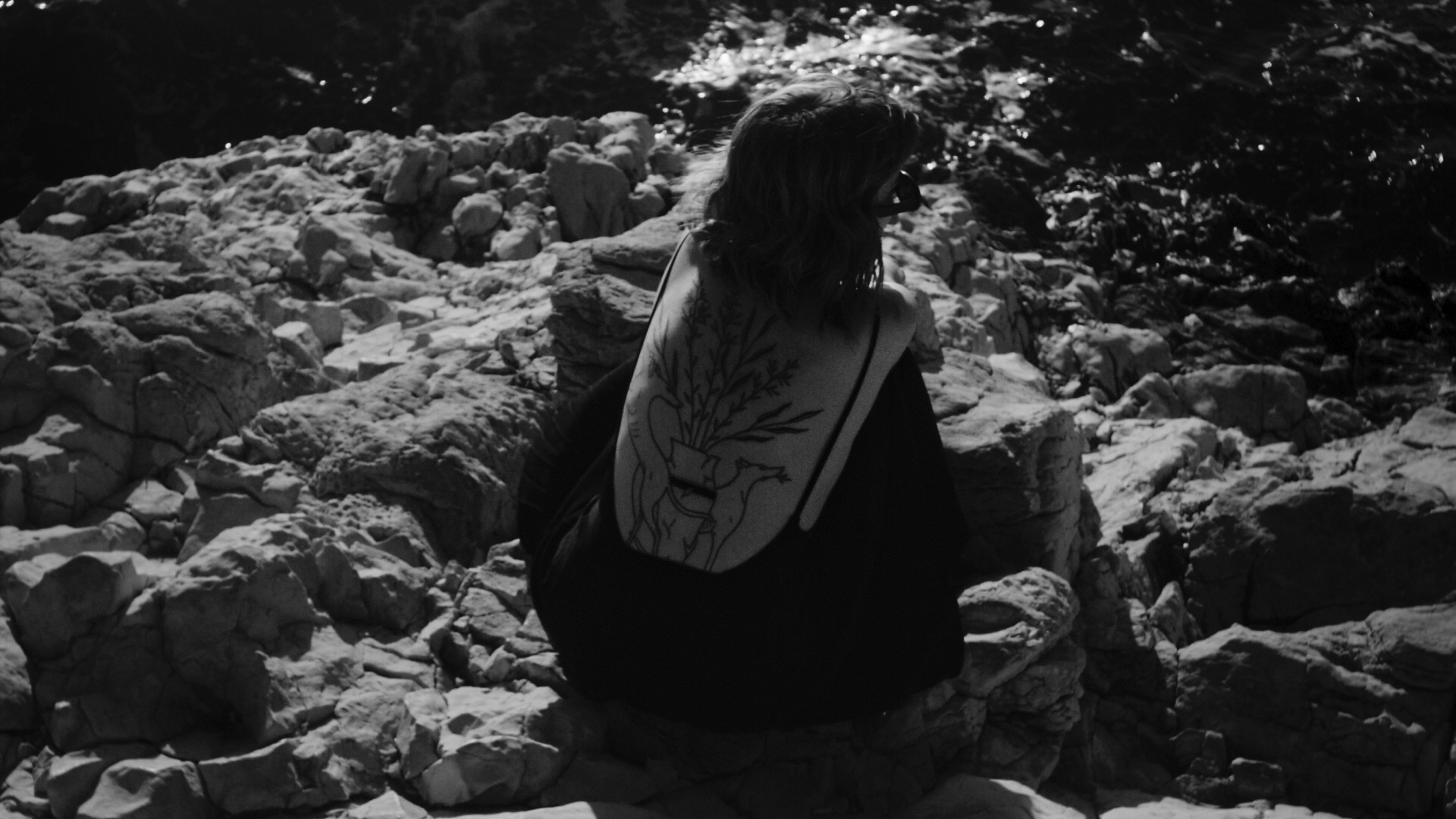 Cinq minutes pour retracer la création d’un tatouage, un dos entier, celui d’Élise. C’est la première fois que Flinart travaille sur un format de cette ampleur, plus proche du tableau que du tatouage. Il nous accueille pendant deux jours dans un grand appartement où plantes, tapis et miroirs se superposent. L’intimité du lieu est suffisante pour laisser pleinement la place au tatoueur et à la tatouée. Une communication silencieuse avec Emma, réalisatrice, permet l’émergence de scènes sincères et douces. Depuis la table à dessin, nous avons la chance de suivre chaque étape de la création du tatouage, mais il était important pour nous de conclure par une séquence d’exposition au monde, une errance dans un extérieur vaste et intemporel. Les calanques de Marseille étaient le décor idéal pour faire ressentir le voyage auquel ce tatouage était destiné. Le noir et blanc s’est imposé comme une évidence pour ce projet. D’abord parce que Flinart a toujours pris plaisir à photographier ses tatouages ainsi, et qu’il était important de s’inscrire dans son langage visuel. Ensuite, la brillance et la densité qui en résulte était la meilleure manière de rendre le trait fin, minutieux et profondément noir du tatouage, Flinart utilise très peu la couleur. Enfin, nous voulions un film où les émotions et les sensibilités soient perceptibles par l’image. Le noir et blanc a été pour nous un moyen d’expression et de sélection, afin d’offrir une représentation du réel équilibrée et de laisser la place restante à l’émotion et au caractère de nos interlocuteur·ice·s.
