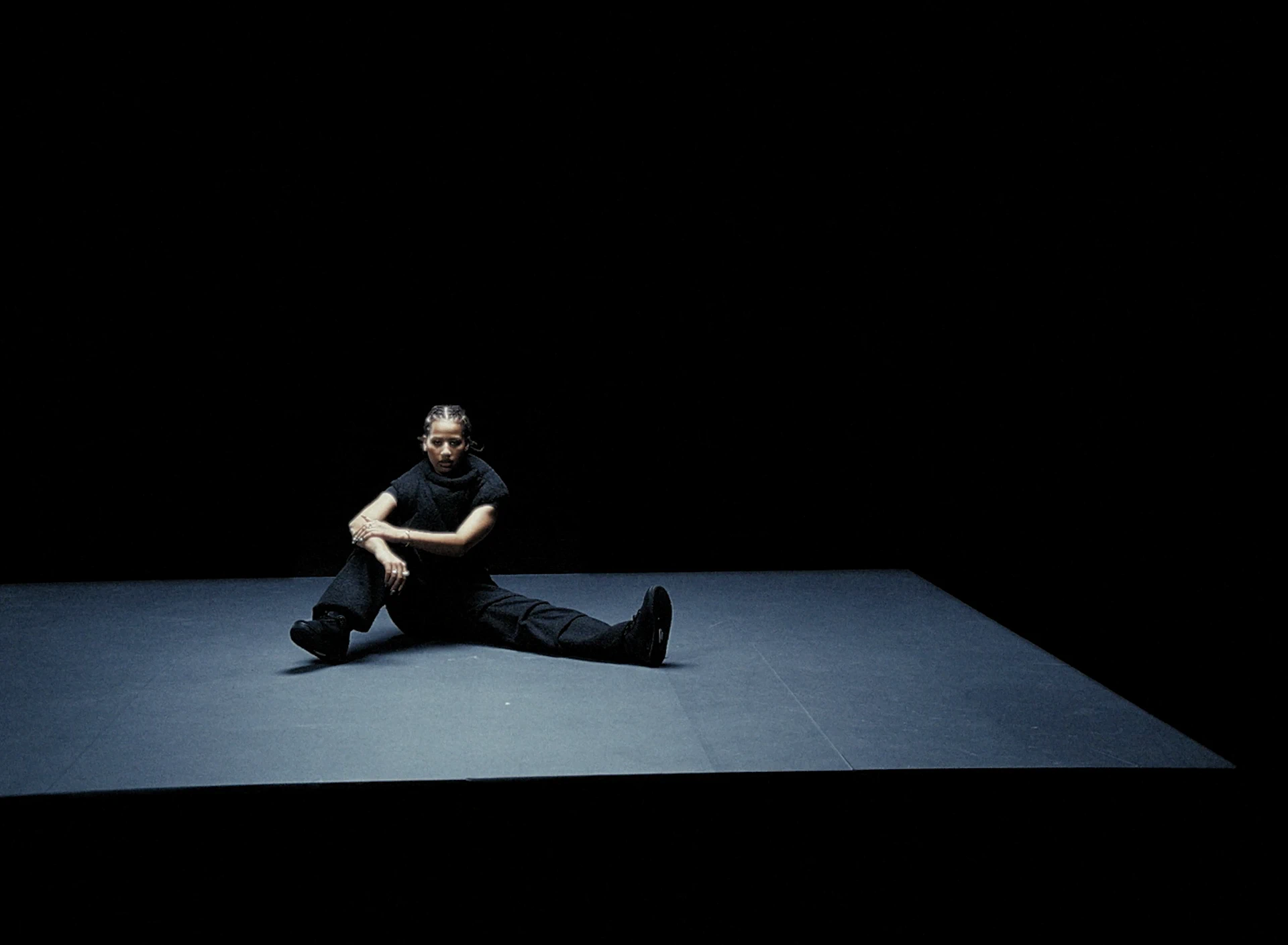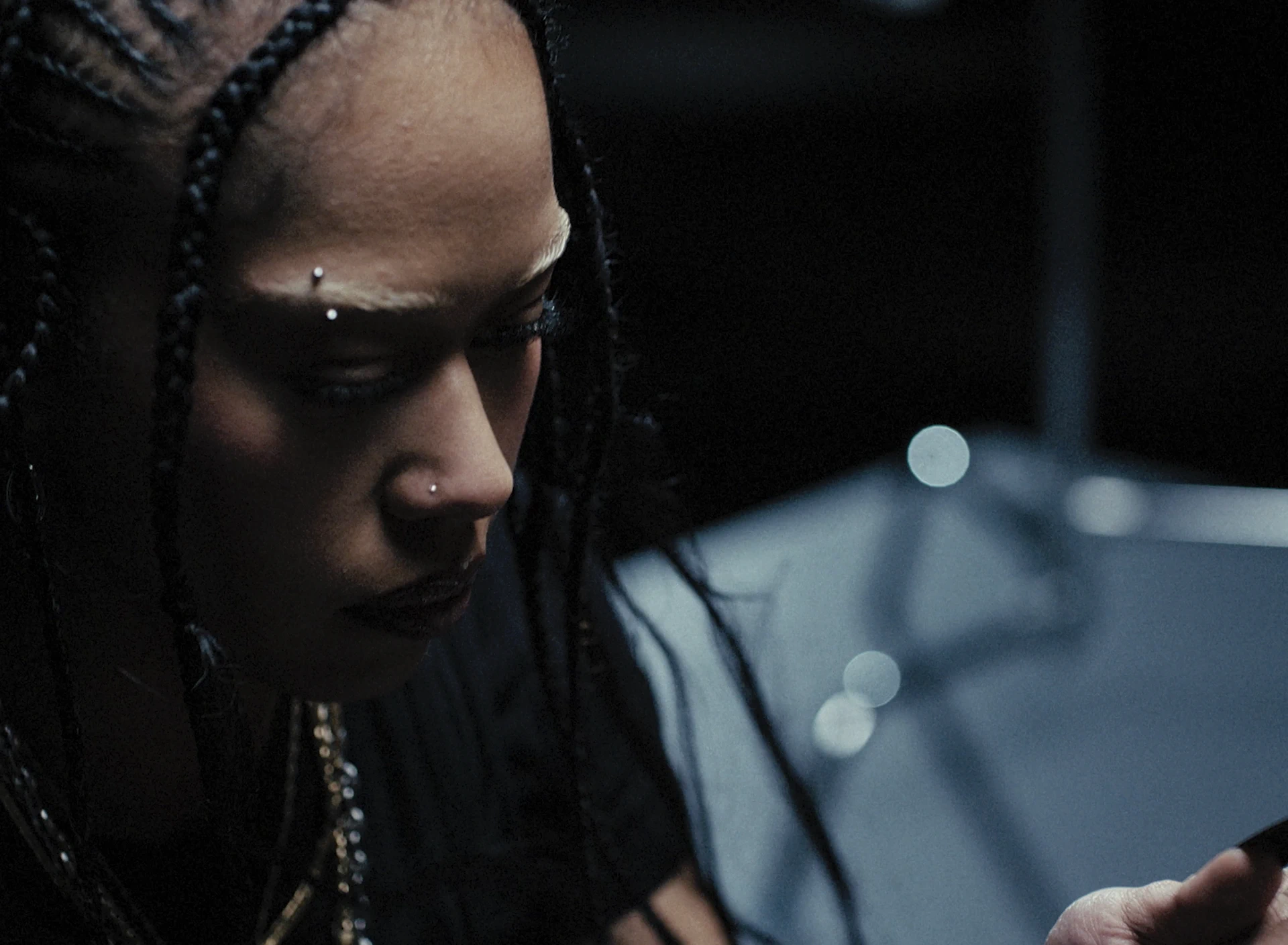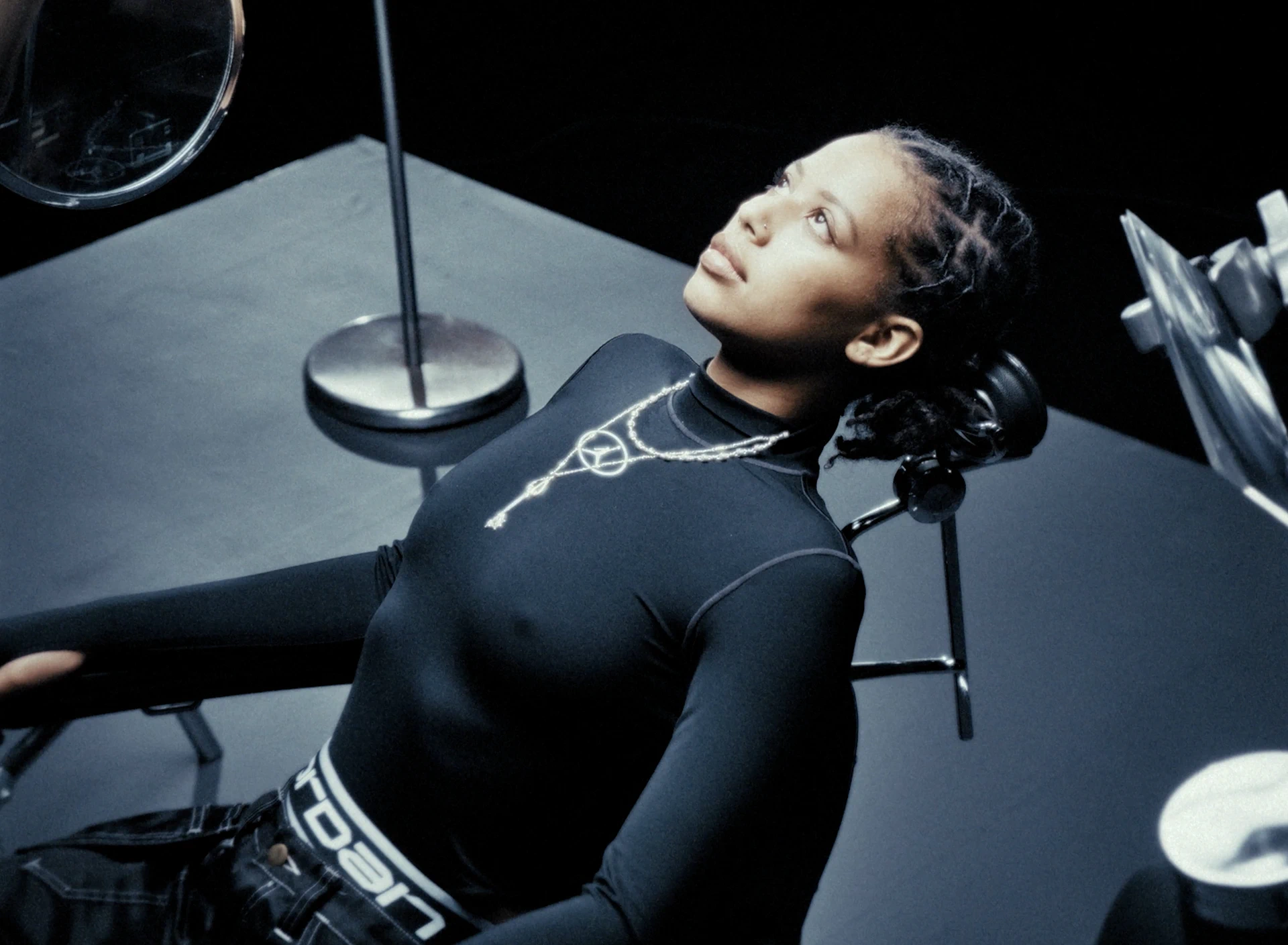 On tourne à l’Alexa Mini avec des Canon FD de TLS et l’Angénieux Optimo HP 25–250mm. La brillance extra des Canon FD TLS nous aides à pousser l’apparition de chaque reflet et pièce métallique. La lumière est presque clinique, découpée sur un décor minimal composé d’une dalle béton et d’une chaise centrale entourée d’éléments optiques : loupes, miroirs teintés, bustes. Ils viennent fragmenter l’image. Le travail d’axes et de reflets nous permet de multiplier les points de vue, de recomposer les silhouettes et d’installer un jeu de tension visuelle permanent autour de la métamorphose de l’artiste.